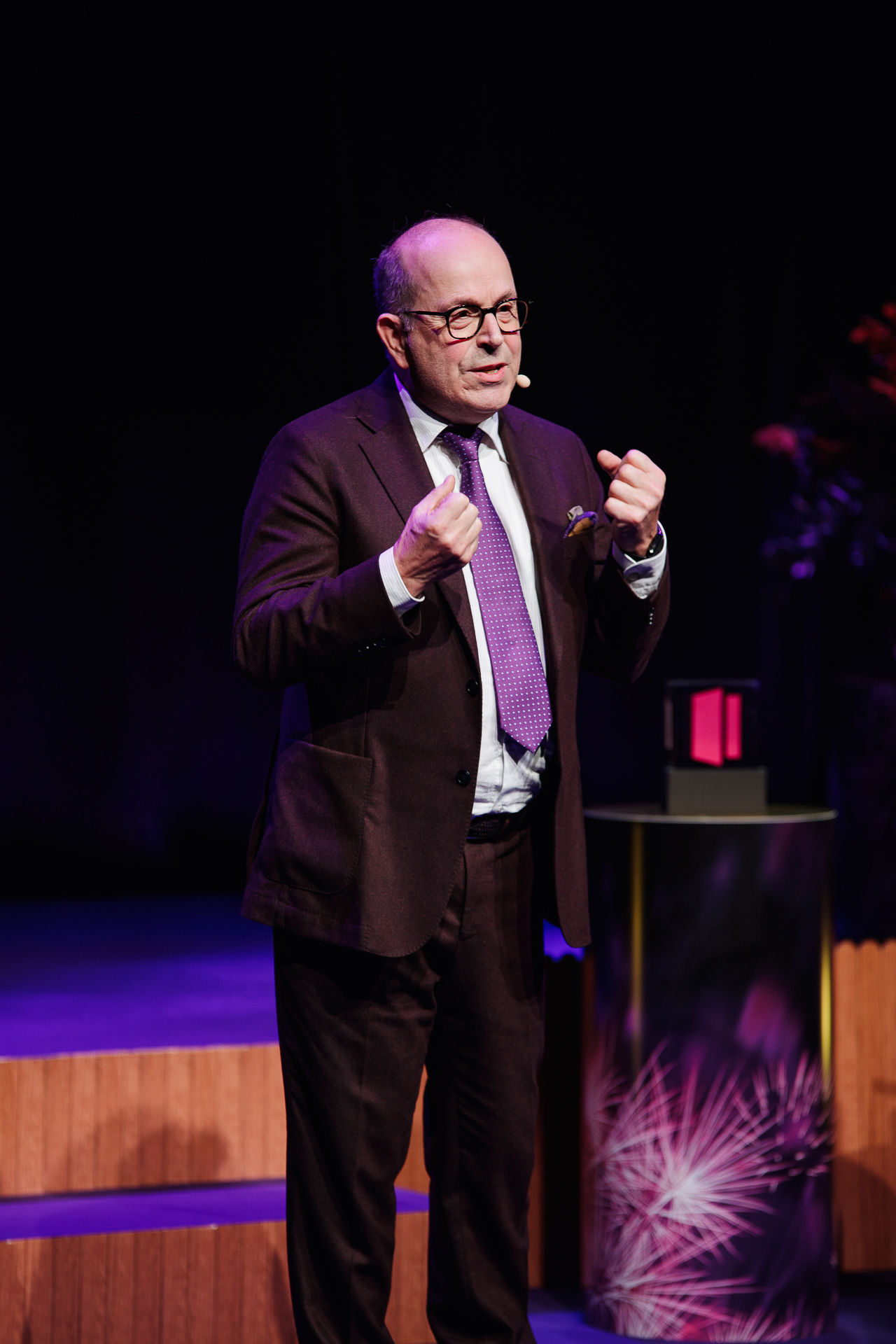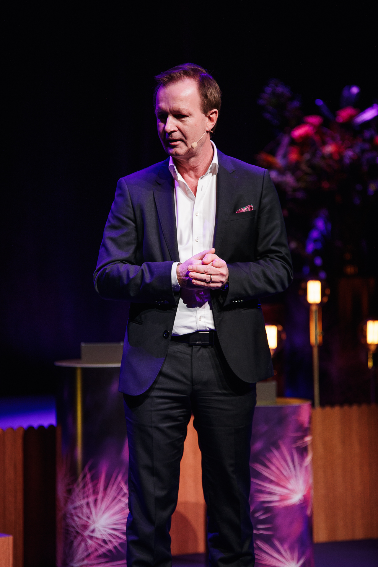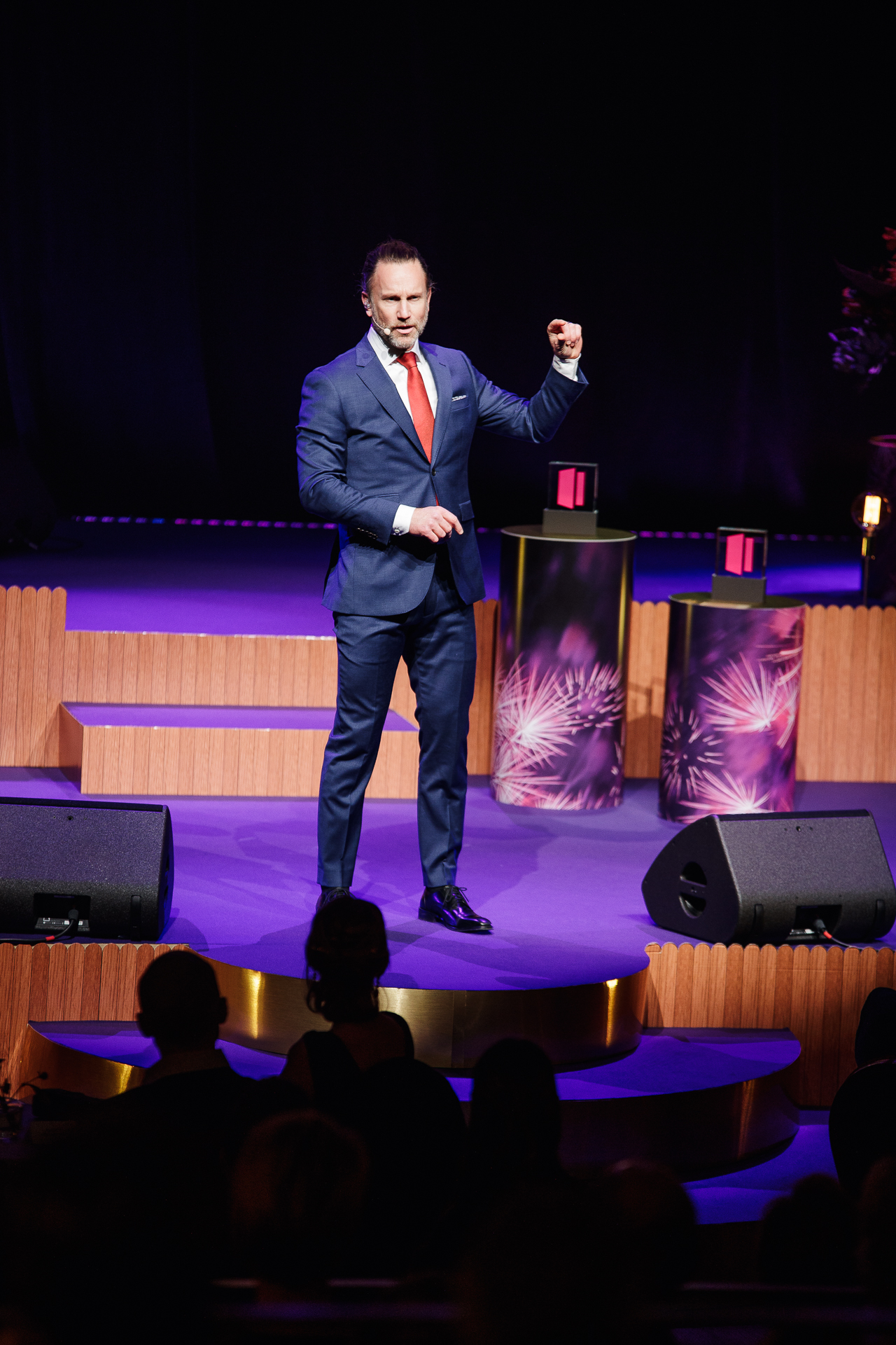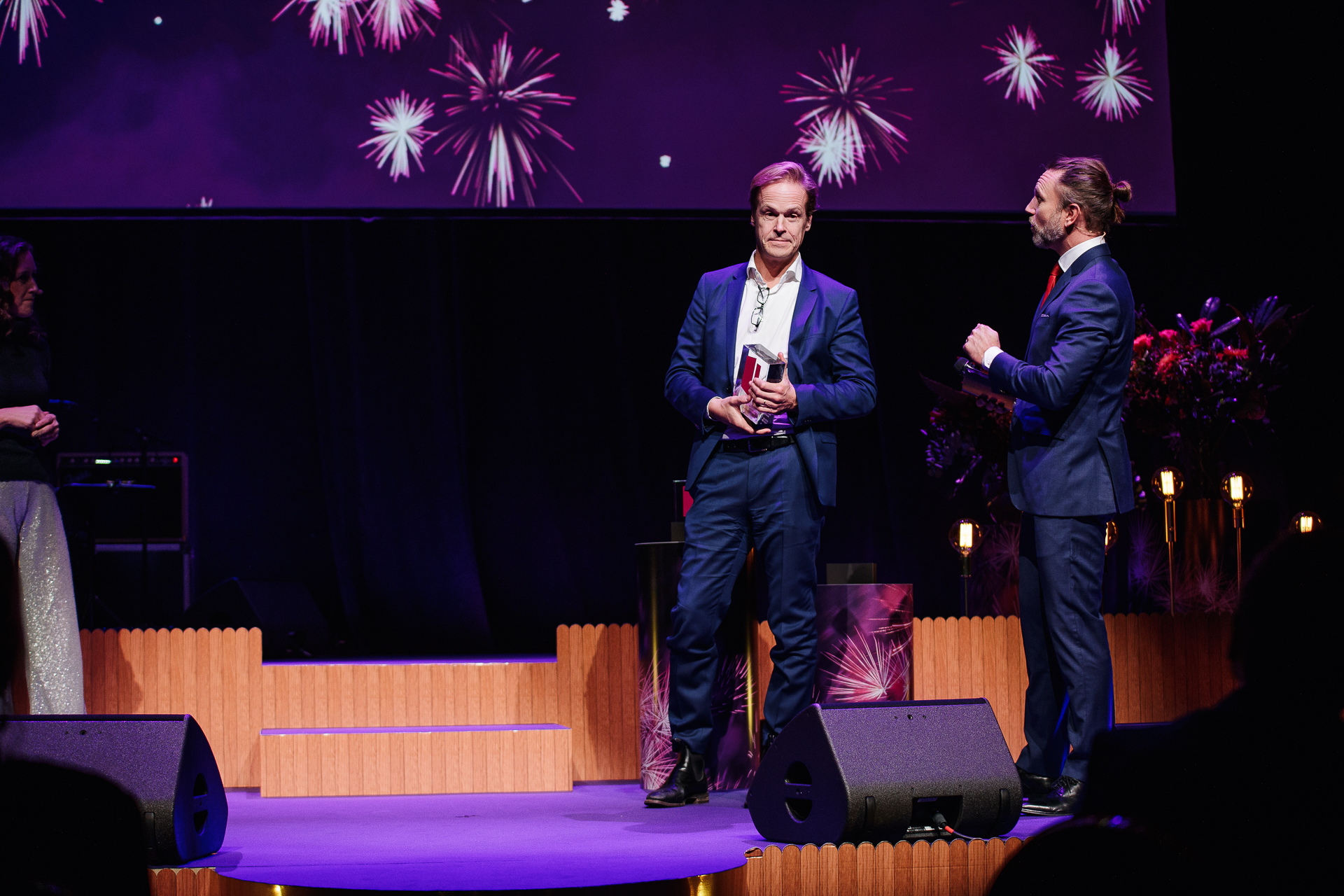En synligt tagen och lycklig vd, Christian Kinch, tar emot priset på scenen.